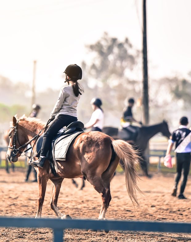 We prioritize safety with gentle, well-trained horses, proper equipment, experienced instructors, and small class sizes. Instructors teach safety practices from day one and supervise closely.